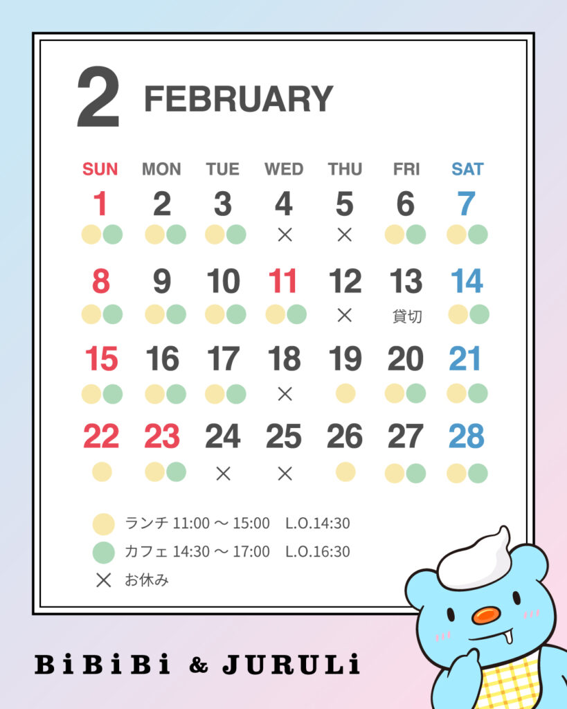 2月の営業スケジュールをご案内いたします。2月からは新しい企画展がスタートします!幅広い世代から愛される「ハッチポッチステーション」のアートディレクションをされた藤枝リュウジさんの展覧会です。どのような展示空間になるのか、今から楽しみです。展覧会と併せて、当店でのお食事やカフェタイムをお楽しみください。