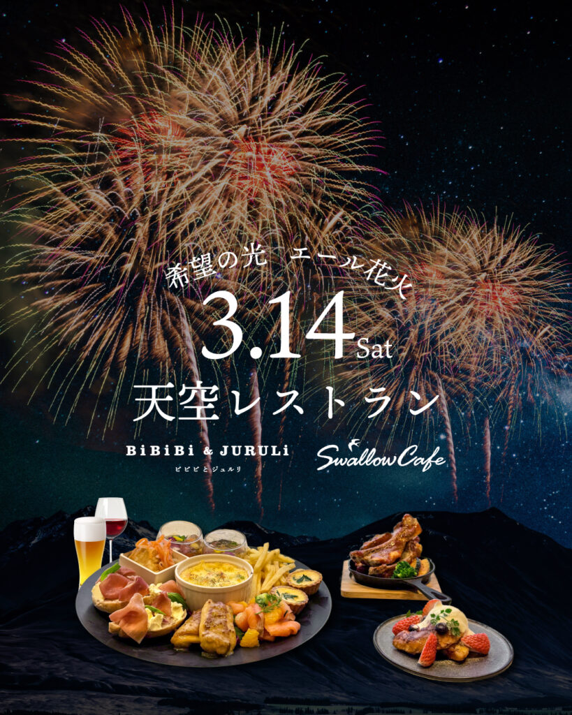 3月に卒業する若者たちの門出を祝し、富岩運河環水公園で「希望の光 エール花火」が開催されます。開催に併せ、当店にて『天空レストラン』を1日限定でオープンいたします。卒業生がリクエストした青春の一曲に合わせ、光のコラボレーションと共に、BiBiBi&JURURLi、Swallow Cafeのスペシャルコースをお楽しみください。